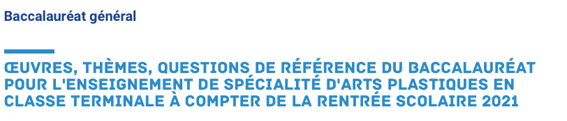 Le programme de l’enseignement de spécialité en arts plastiques de la classe terminale institue des œuvres, thèmes et questions de référence. Ils sont régulièrement renouvelés et publiés au Bulletin officiel de l’éducation nationale, de la jeunesse et des sports.