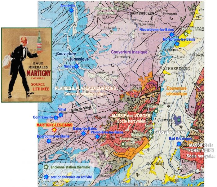 Fig.1: Carte géologique de l'Est de la France et localisation des principales stations thermales (extrait de la carte géologique de la France à 1/500.000 © BRGM) et affiche publicitaire (non datée)