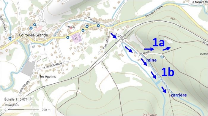 Les affleurements se situent d'une part dans un chemin creux qui monte à gauche depuis la dernière maison jusqu'au réservoir d'eau (site 1a) et d'autre part le long du chemin qui suit le ruisseau en remontant à droite jusqu'à une petite carrière exploitée par la commune à des fins d'empierrements (site 1b).
