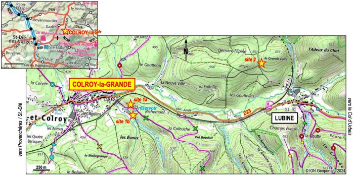 Fig. 2: Affleurements de houiller dans le fossé d'effondrement de Colroy (Sites 1a et 1b) (extrait de carte © IGN-Géoportail 2024).