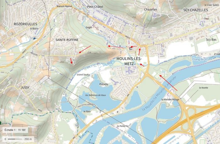 Fig. 1: Plan d'accès à Ste-Ruffine depuis A31 (flèches rouges)(© IGN-géoportail)