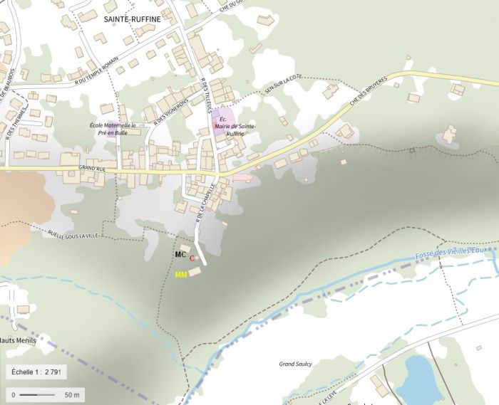 Fig.2 : Plan d'accès détaillé (© IGN-géoportail MC=Maison Carl, MM=Maison Mercy, C=Chapelle)