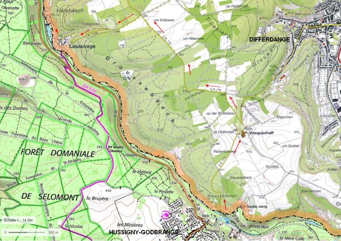 Fig. 1: Accès à Lasauvage (Luxembourg) depuis Hussigny-Godbrange (Meurthe-et-Moselle France) (flèches rouges) (© IGN-géoportail)