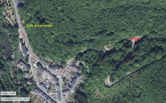 Arrivé à Lasauvage (fig.2), en bas de la descente, continuer vers la droite et stationner sur un des parkings près de l'église depuis laquelle l'affleurement du travertin (ou cron sur fig.2) de Lasauvage est bien visible. Il se trouve sur la droite de la route en face d'un parc aménagé et à proximité d'un arrêt de bus et d'un parking.