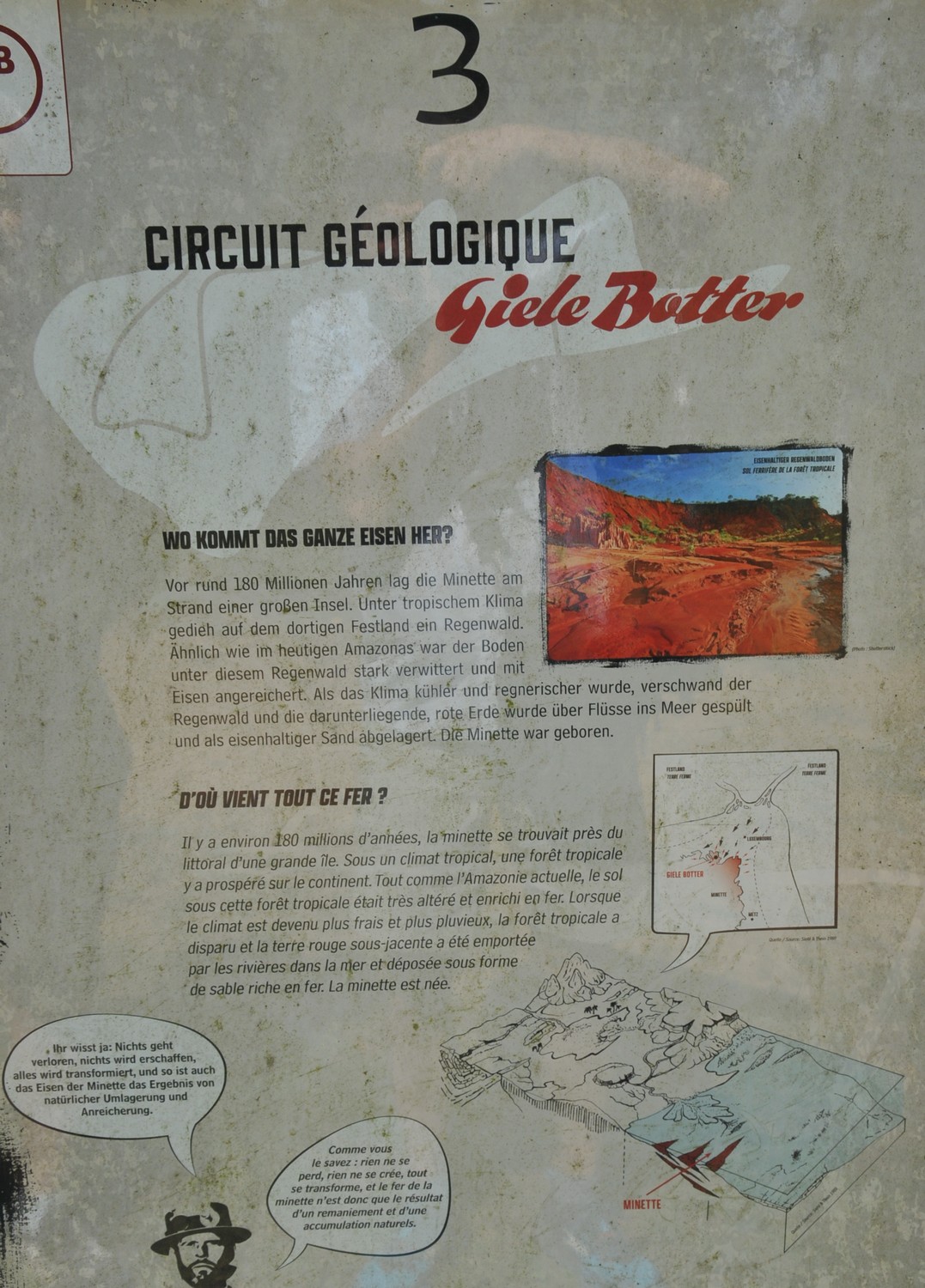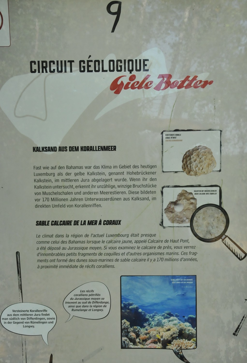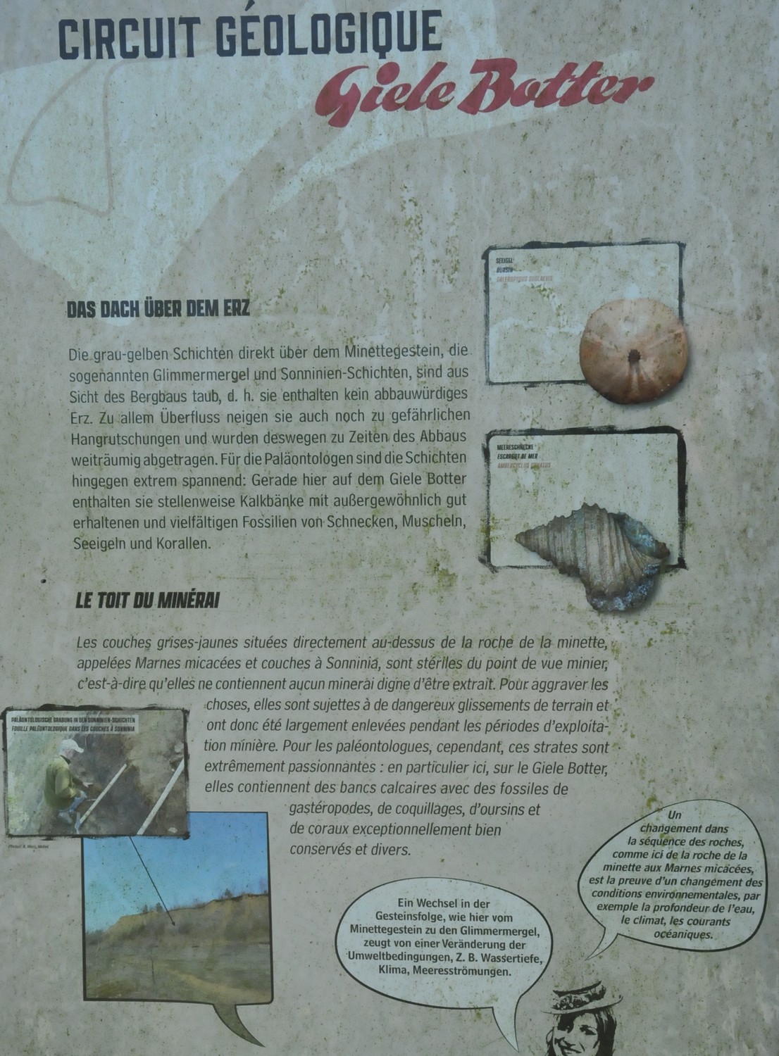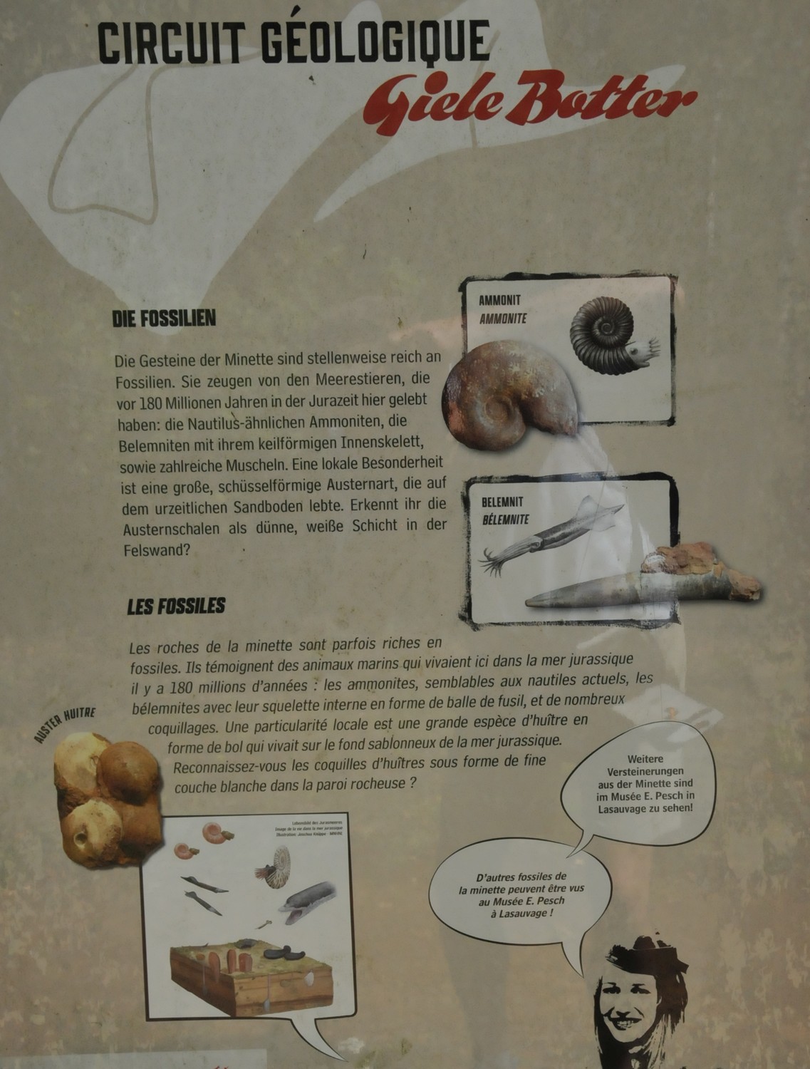 Galerie de panneaux illustrés implantés le long du sentier géologique en langue française et luxembourgeoise :