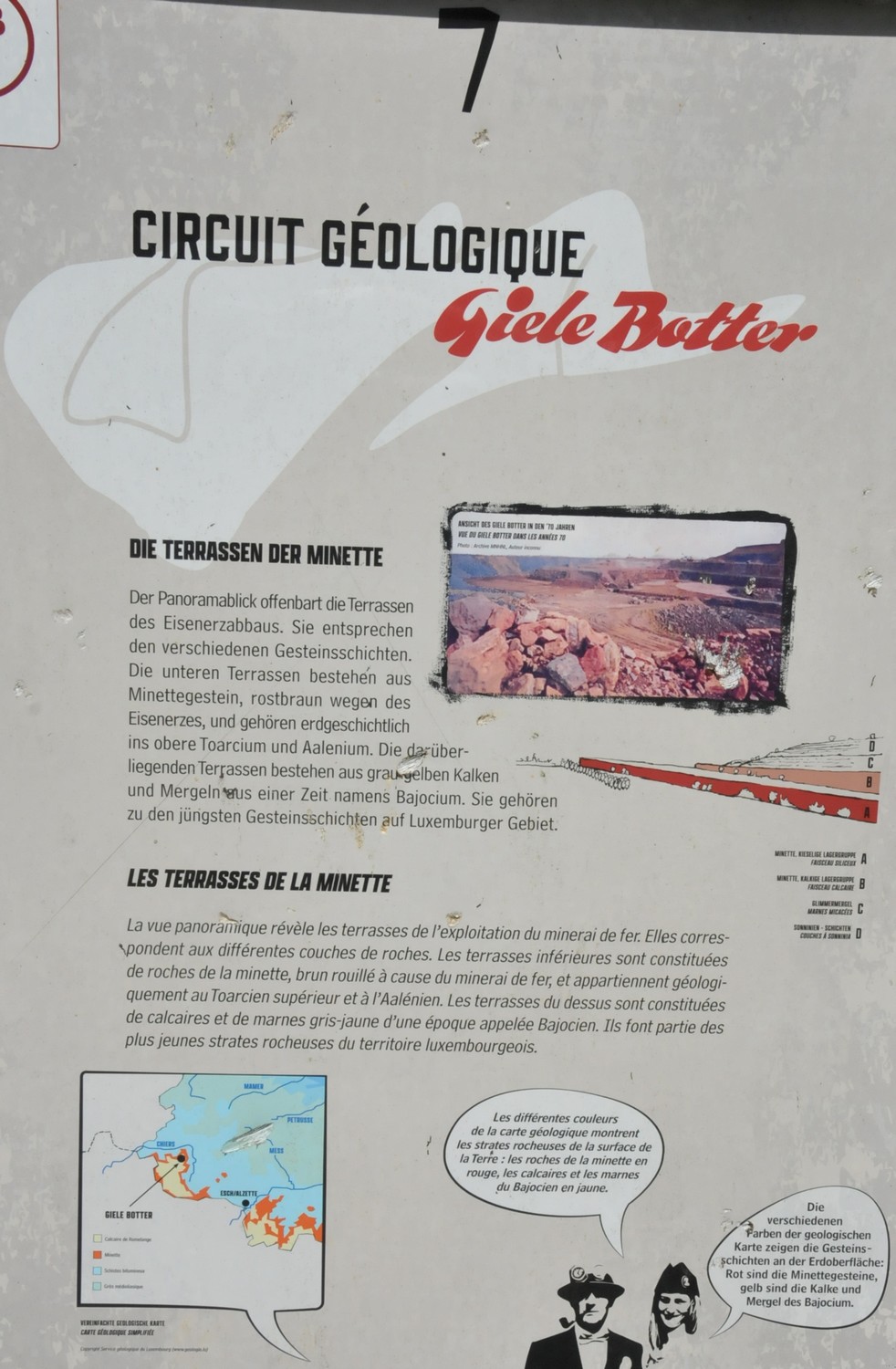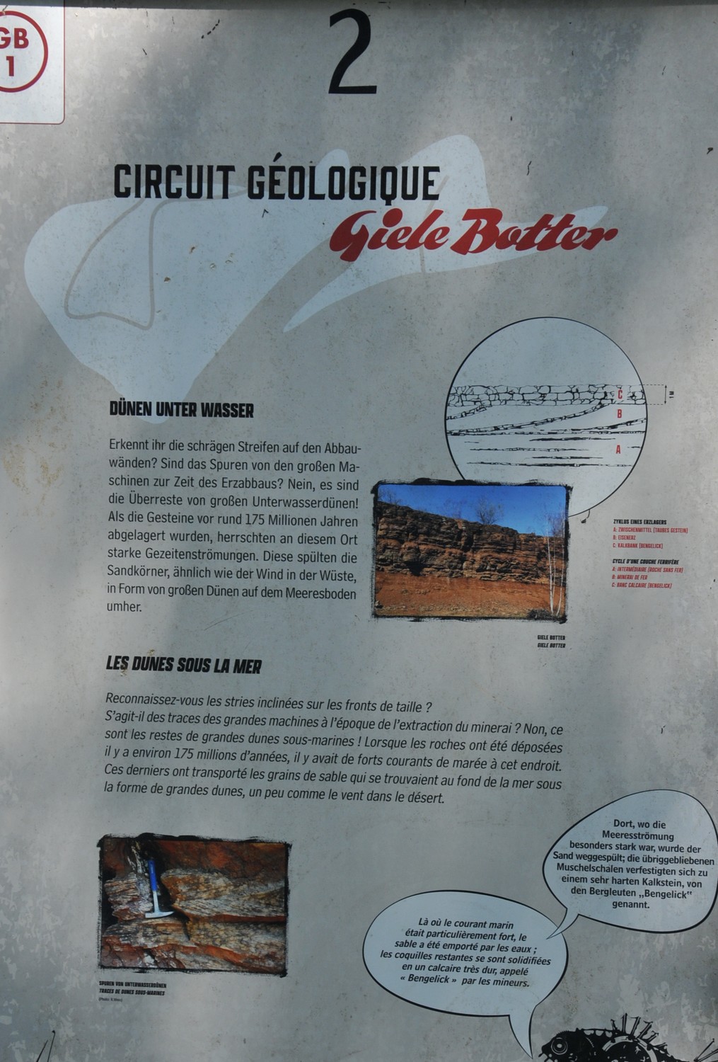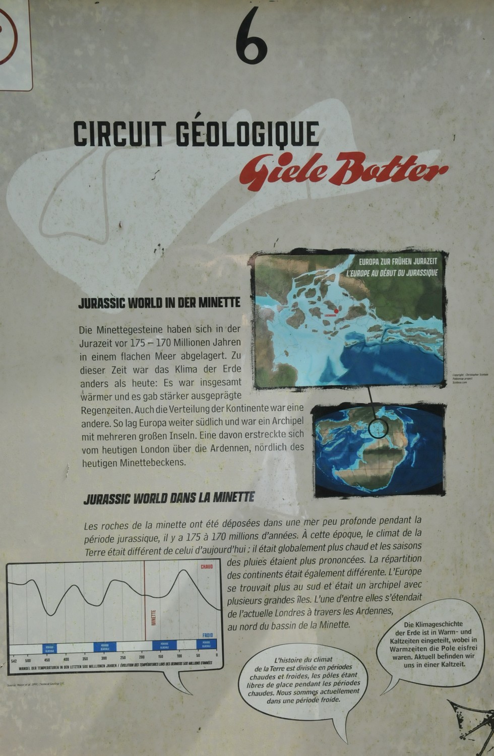 Galerie de panneaux illustrés implantés le long du sentier géologique en langue française et luxembourgeoise :
