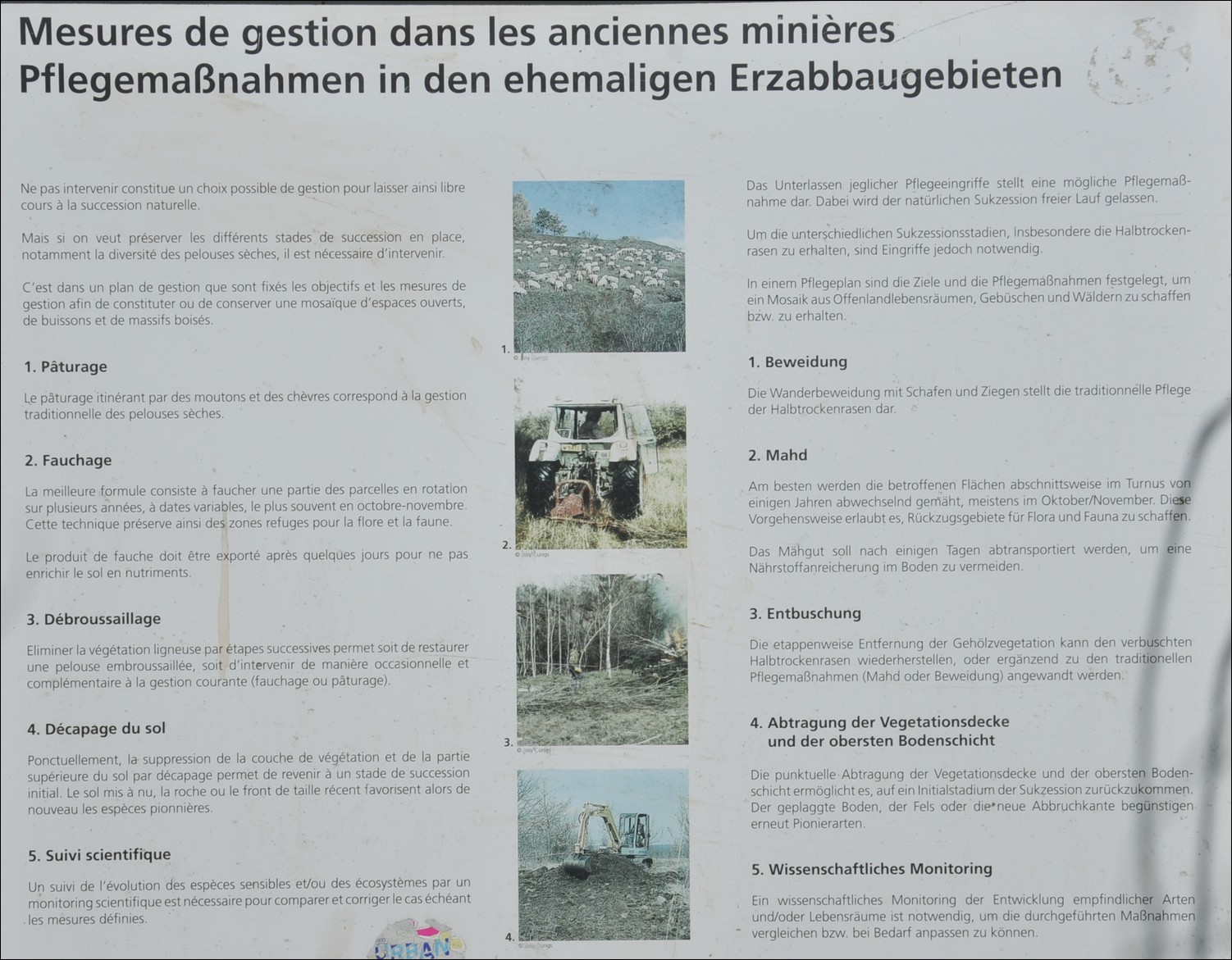 Panneaux sur le chemin menant au sentier géologique expliquant la gestion du site: