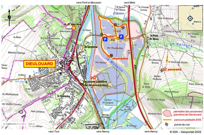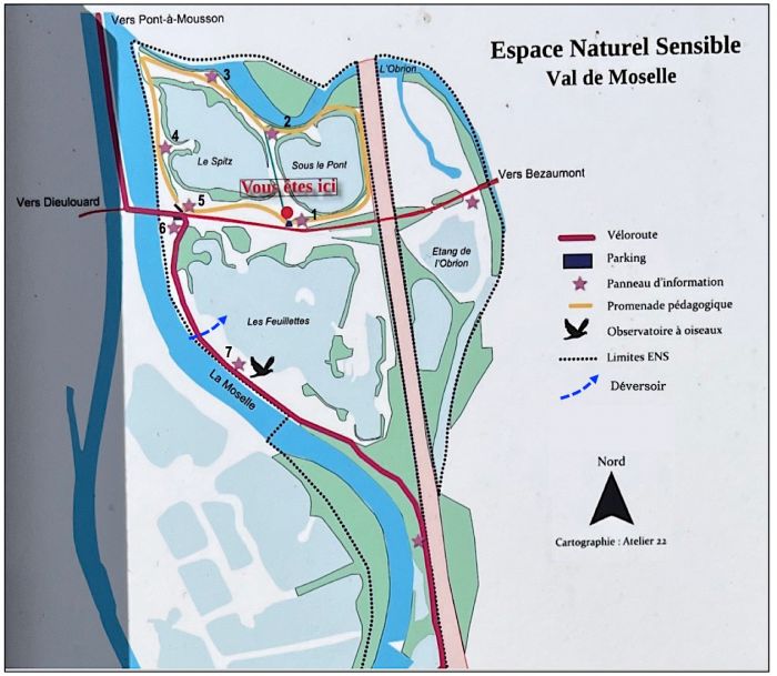 Dans la partie nord de l'ENS, située au niveau de Dieulouard, un parcours pédestre, une piste cyclable (voie verte et bleue) et un observatoire ornithologique (fig.2 et 4) ont été aménagés autour des plans d'eau (étangs de Spitz, sous le Pont, des Feuillettes et de l'Obrion). Une série de panneaux pédagogiques et de sensibilisation sur les composantes de ce patrimoine naturel à préserver (textes traduits en allemand et en anglais), jalonnent le parcours (fig.4).