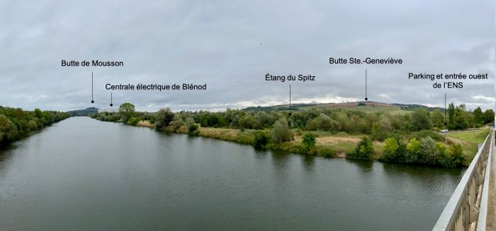 La promenade de découverte dans les anciennes gravières réhabilitées peut être complétée par une vue panoramique sur la vallée de la Moselle et une lecture du paysage depuis un point haut (250 m), à hauteur d'une ligne de pylones haute-tension, au-dessus du lieu-dit le Pont de Mons (commune de Bezaumont - fig.2). Il faut s'engager sur une route étroite carrossable mais un peu dégradée pour y parvenir. En voiture, sur cette voie en cul-de-sac, une manœuvre sera nécessaire pour un demi-tour au point d'observation.