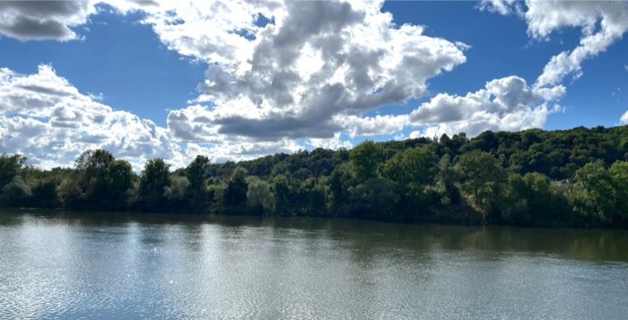Fig.1 : La Moselle à Dieulouard et la chapelle de Notre-Dame des Airs émergeant au-dessus de la Côte Cuite boisée, vues depuis l'étang du Spitz