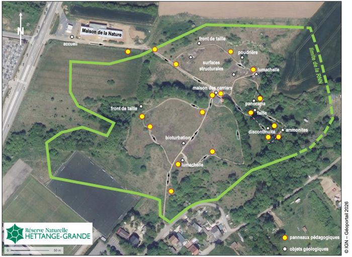 Fig.2: Le parcours balisé (flèches) et principaux points d'intérêt dans la Réserve Naturelle Nationale d'Hettange-Grande (vue aérienne © IGN-Géoportail 2026)