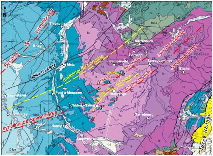 Fig.5 : Plis SW-NE dans l'Est du Bassin de Paris. Axes synclinaux en pointillés rouges ; replis anticlinaux en pointillés jaunes dans le synclinorium de Sarreguemines ; site étudié = étoile rouge ; 1 à 5 : buttes-témoins et synclinaux "perchés" avec 1 : Vahl-Ebersing-Maxstadt (Bruhlwald), 2 : Chemery-Landroff, 3 : Serres , 4 : Bride, 5 : Château-Salins ; âge des terrains en brun = socle varisque-hercynien ; en gris = Houiller (h) et Permien (r) ; en rose-violet = Trias (t) ; en bleu = Jurassique (j) ; en jaune = Tertiaire ; en blanc = Quaternaire-récent (fond de carte © BRGM-InfoTerre).