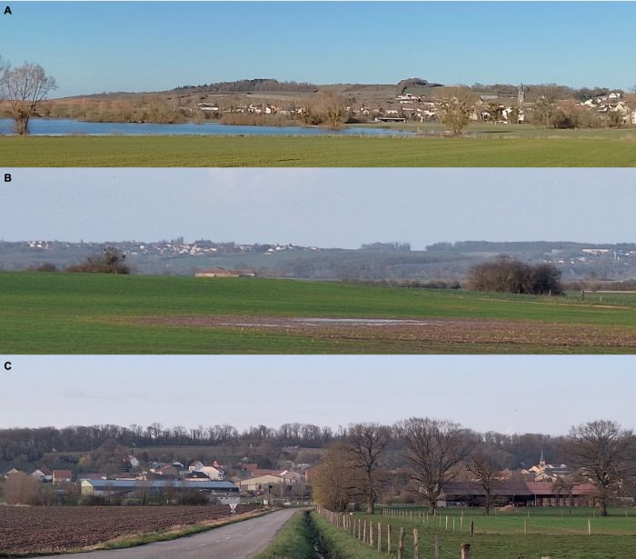 Fig.6 : Trois clichés de la butte-témoin de Vahl-Ebersing-Maxstadt (vues vers l'est depuis la plaine du Bischwald) - A : extrémité nord de la butte et le village de Lelling au pied ; B : la butte et les villages de Lixing-lès-St.-Avold et de Laling au sommet ; C : la butte et le village de Fremestroff au premier plan (crédit photos : David Cordonnier - mars 2026)