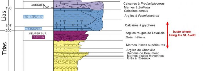 Les roches qui affleurent au niveau des buttes témoins sont essentiellement des roches cohérentes, des grès et des calcaires de la transition Trias-Jurassique appartenant au Rhétien et à l'Hettangien-Sinémurien (fig.7). Les dépressions sont occupées par les faciès argilo-marneux et évaporitiques du Keuper moyen (voir la fiche Landroff).