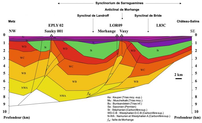 La connaissance du socle paléozoïque, sous la couverture triasique discordante (lacune de l'étage Indusien de la base du Trias), a été révélée par les données gravimétriques, magnétiques, géophysiques et les sondages profonds issus de campagnes réalisées dans les années 2000-2010. Le bassin permo-carbonifère sarro-lorrain, marqué notamment par une forte anomalie gravimétrique négative (Debeglia, 2014), est représenté par près de 8 000 mètres de dépôts houillers plissés et faillés, surmontés de grès permiens et rhyolites interstratifiées (fig.8). Une surface d'érosion affecte également les derniers dépôts du Westphalien (WD, fig.9) ; elle serait liée à une phase de compression tardi-orogénique pendant le Westphalien D, avant une reprise de la sédimentation au Stéphanien-Permien (Izart et al., 2017). L'ensemble de la série repose sur une ride cristalline constituée de granites peut-être d'âge éo-varisque (Edel, 2008).