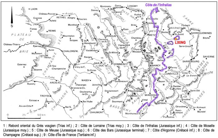 Fig.4 : Position de la Côte de l'Infralias dans le paysage de relief de côte de l'est du Bassin parisien (d'ap. Hilly et Haguenauer, 1979).