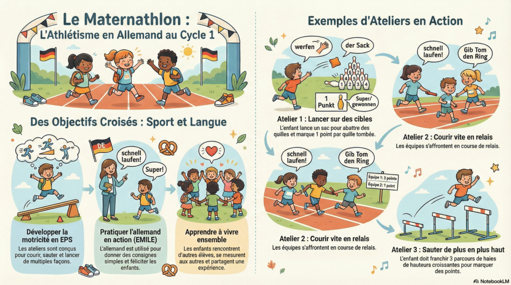 Voici donc une nouvelle ressource EMILE qui offre une approche pédagogique innovante et stimulante. Grâce à l’EMILE, on combine l’apprentissage de l’allemand avec le développement psychomoteur des élèves contribuant ainsi à l’épanouissement global de l’élève. Cette ressource EMILE se compose de fiches proposant des objectifs clairs en EPS et en langue étrangère ainsi qu’un déroulement précis facile à mettre en œuvre. Ainsi, la langue allemande est pratiquée d’une manière ludique et motivante.