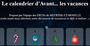 L’équipe des ERUN54 a le plaisir de vous présenter le nouveau calendrier d’AVANT... LES VACANCES du 01 au 19 décembre 2025. Cette année, deux journées seront consacrées à chaque ressource : J1 pour une présentation et J2 pour un défi à réaliser.