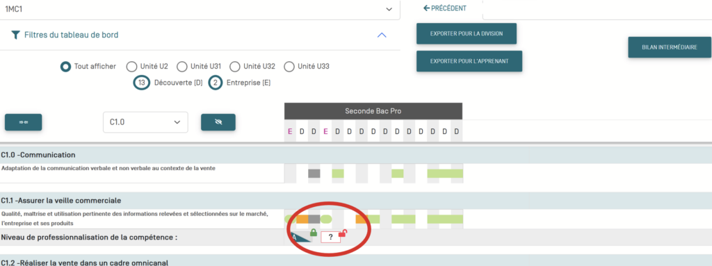 Les bilans intermédiaires se font dans les tableaux de bord de suivi par les enseignants professionnels en charge. Le DDFTP peut les verrouiller en cas d’erreur.