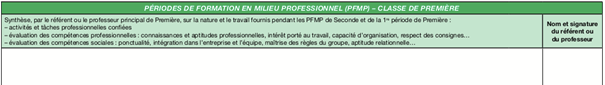 Tout comme l’appréciation générale, cette synthèse sur la nature du travail fourni pendant les PFMP de seconde et première est un texte comportant un maximum de 1000 caractères.