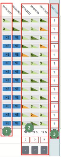 Le choix de la période se fait en cliquant sur le bouton « ? » sur fond gris, lorsqu’aucune période n’a encore été positionnée. Le bouton indique alors le type de période retenu (“T” pour trimestre et “S” pour semestre) ainsi que le numéro de la période (exemple : « S1 » pour Semestre 1). Vous pouvez changer la période en cliquant à nouveau sur le bouton gris.