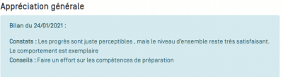 Il s’agit d’un texte pour refléter l’appréciation générale sur le niveau d’implication et les progrès de l’élève pour toute l’année scolaire en cours.