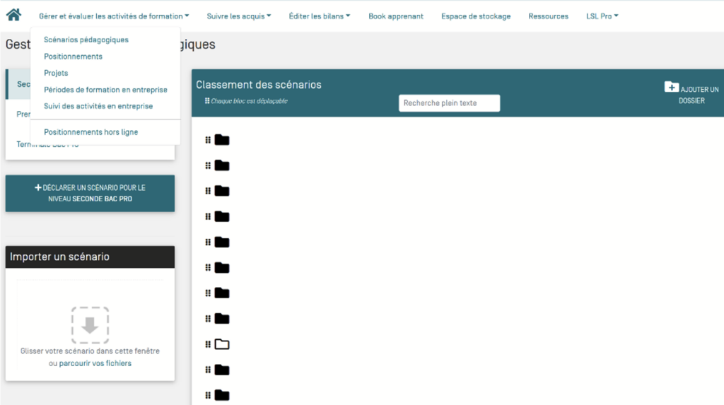 Ce module, permet la déclaration et la gestion de scénarios pédagogiques. Par défaut, les scénarios sont partagés à l’équipe pédagogique d’un même établissement et sont réutilisables d’une année sur l’autre. Ils sont associés à un diplôme et à un niveau de classe. Tous les scénarios peuvent être consultés, exportés aux formats ODT et DOCX pour impression, dupliqués, et partagés à autre établissement abonné à CPRO.