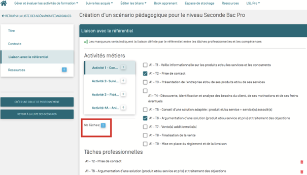 Un clic sur une tâche permet de la sélectionner : elle apparaît alors dans la liste des tâches professionnelles à réaliser pour ce scénario.