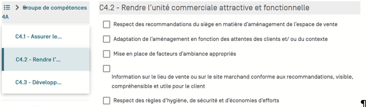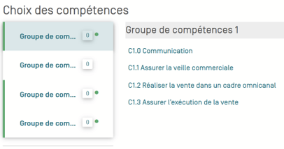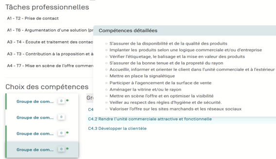 Attention: Les compétences liées aux tâches professionnelles précédemment sélectionnées apparaissent taguées d’un point vert pour faciliter leur sélection. Ce repérage est établi grâce à la matrice de mise en relation des tâches et des compétences du référentiel