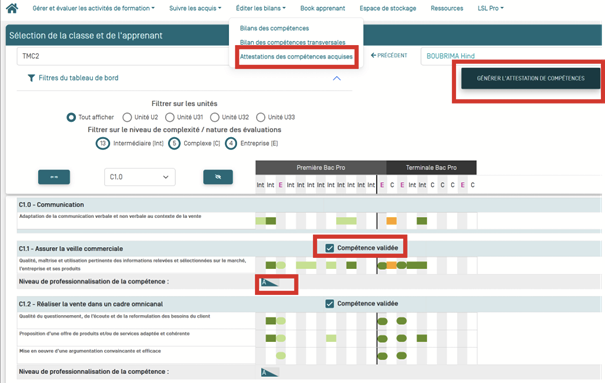 À partir des données présentées dans ce tableau de bord, il est possible de valider individuellement chacune des compétences pour créer ensuite l’attestation de compétences correspondante.