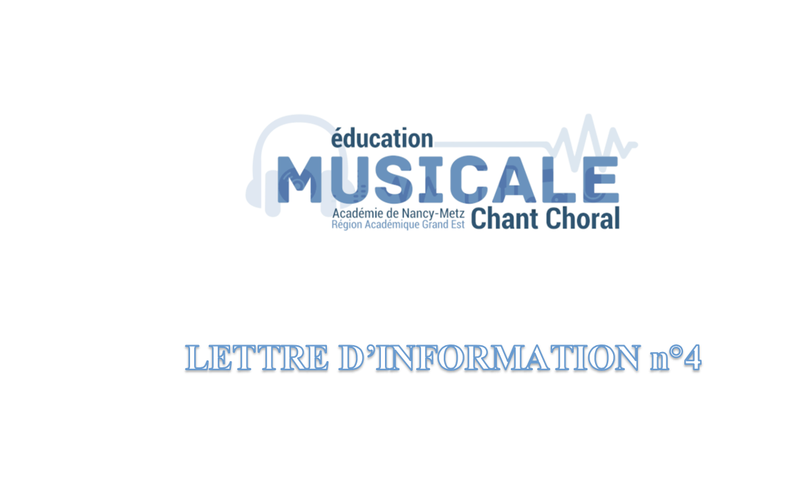 Lettre info n°4Parution de la lettre info n°4 en éducation musicale et chant choral : https://sites.ac-nancy-metz.fr/education-musicale/chant-choral/wp-content/uploads/2025/07/Lettre-info-n°4.pdf