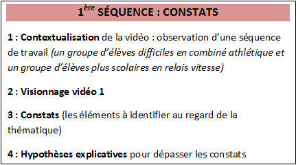 Cette première séquence vidéo filme des élèves dans une situation de relais 2X30m en deux contre un. Deux coureurs qui se relaient contre un élève qui court seul sur 60 mètres. L'enjeu de cette vidéo est de faire émerger des constats et des hypothèses explicatives sur des conduites typiques d'élèves différentes dans leur capacité à ajuster les vitesses ainsi que sur leur capacité à assumer avec efficacité le rôle d'observateur afin d'en déduire des régulations en termes de stratégies d'enseignement pour aller plus loin dans les apprentissages de ces élèves.
