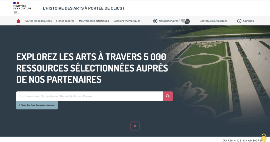 Depuis 2009, le ministère de la Culture apporte sa contribution à l’enseignement de l’histoire des arts avec le portail « Histoire des arts » dont l’objectif est de donner gratuitement accès à une large offre de ressources éducatives en ligne produites par des institutions culturelles situées sur l’ensemble du territoire national.