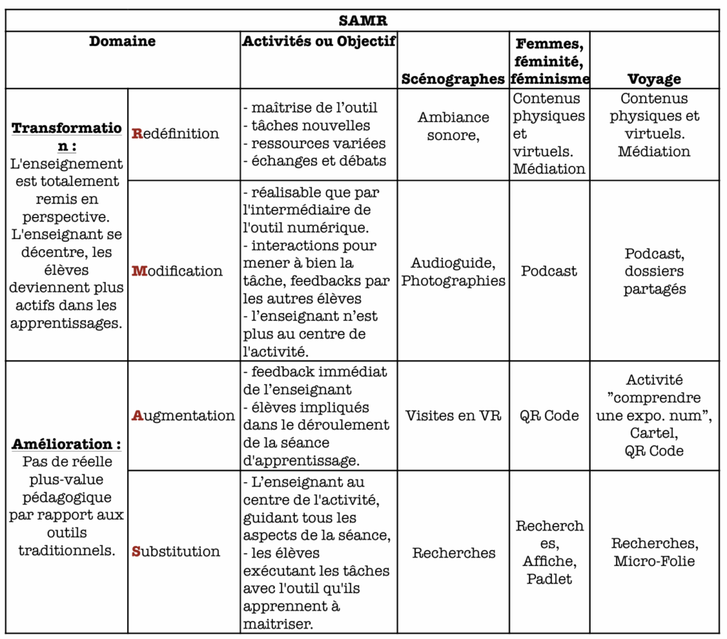 Le tableau ci-dessous montre la plus-value du numérique dans ce genre de travail selon le modèle de plus en plus répandu SAMR du professeur Puentedura.