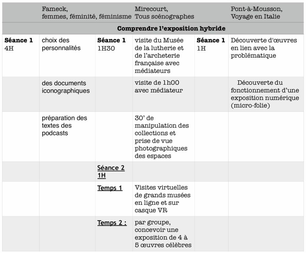 Quatre enseignants, dans quatre établissements et trois contextes différents, ont eu en projet de travailler sur la préparation d’une exposition hybride. Ces projets sont présentés ensemble dans la mesure où la démarche a été similaire : comprendre ce qu’est une exposition hybride afin d’en réaliser une.