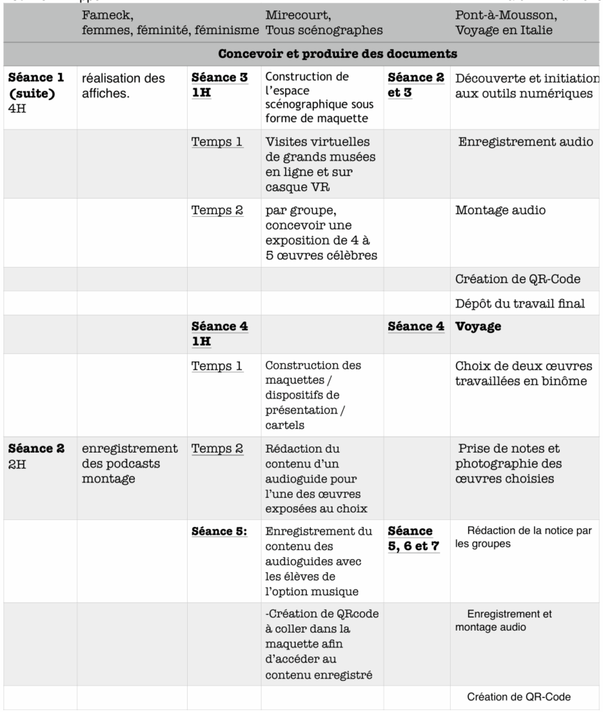 Dans ces trois projets, il s’agissait à terme de concevoir des réalisations sonores (podcasts) et plastiques (affiches ou maquettes…) qui permettaient à des élèves de faire découvrir à leur pairs, à partir de QR Code, un corpus d’œuvres ou un ensemble de personnes.