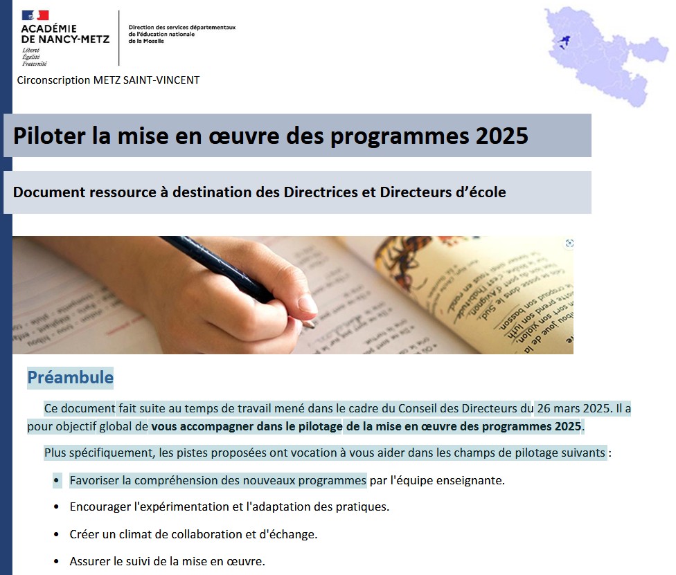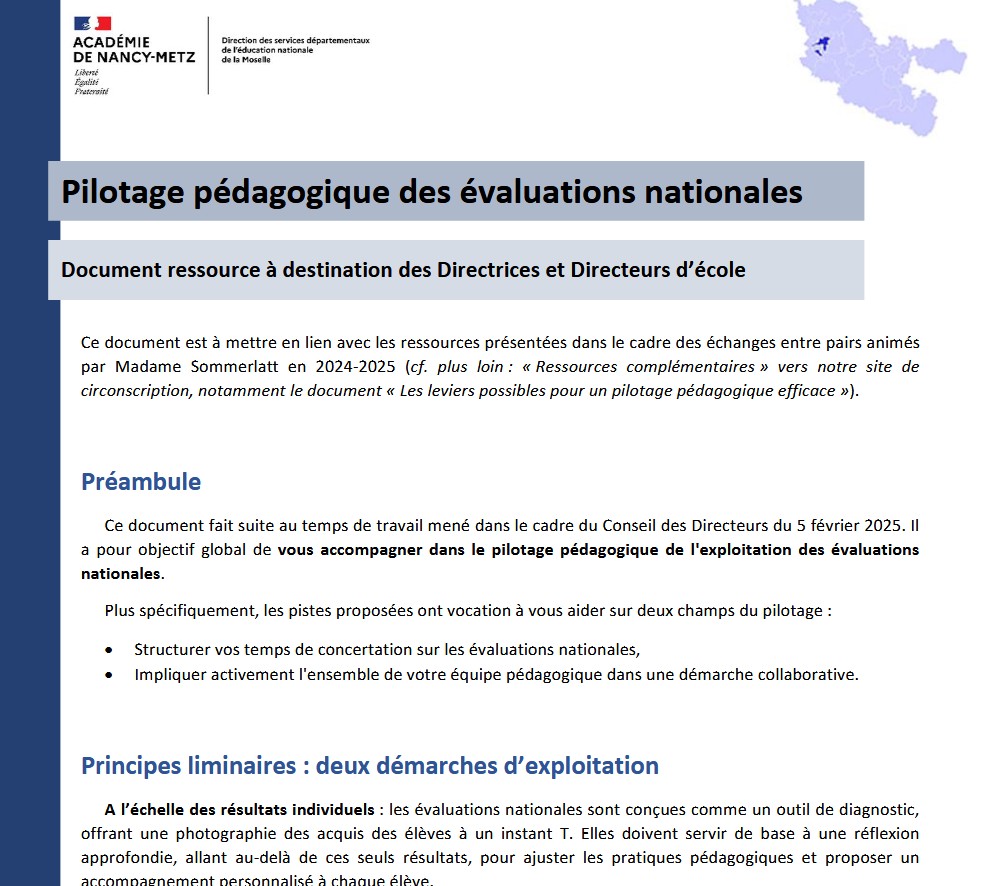 Document ressource à destination des Directrices et Directeurs d’école à mettre en lien avec les ressources présentées dans le cadre des échanges entre pairs animés par Madame Sommerlatt en 2024-2025 (cf. plus loin : « Ressources complémentaires » vers notre site de circonscription, notamment le document « Les leviers possibles pour un pilotage pédagogique efficace »)
