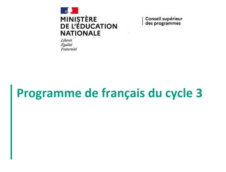 Le cycle 2 a posé chez l’élève les fondements de la langue française, tant à l’oral qu’à l’écrit, en plaçant au cœur des apprentissages la lecture et l’écriture. Le cycle 3 poursuit et intensifie cette dynamique, en visant l’autonomie de l’élève. À la fin du cycle 3, l’élève doit pouvoir s’exprimer aisément à l’oral, comprendre et apprécier les textes adaptés à son âge, écrire en appliquant les règles fondamentales de l’orthographe et de la syntaxe et savoir organiser, de façon simple, mais claire, les différents éléments de son propos...