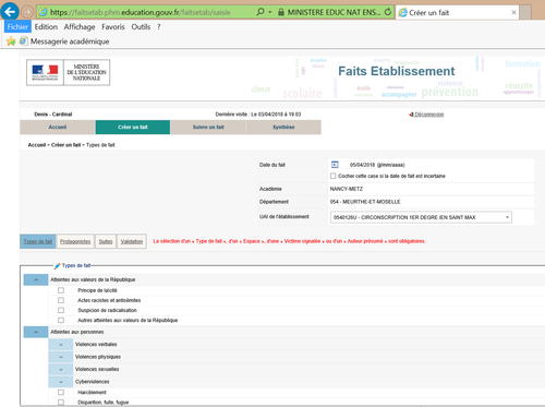 Application destinée à enregistrer et transmettre les faits significatifs et en permettre le suivi en lien avec les autorités académiques. Il s'agit par ailleurs d'un outil de pilotage pour l'établissement.