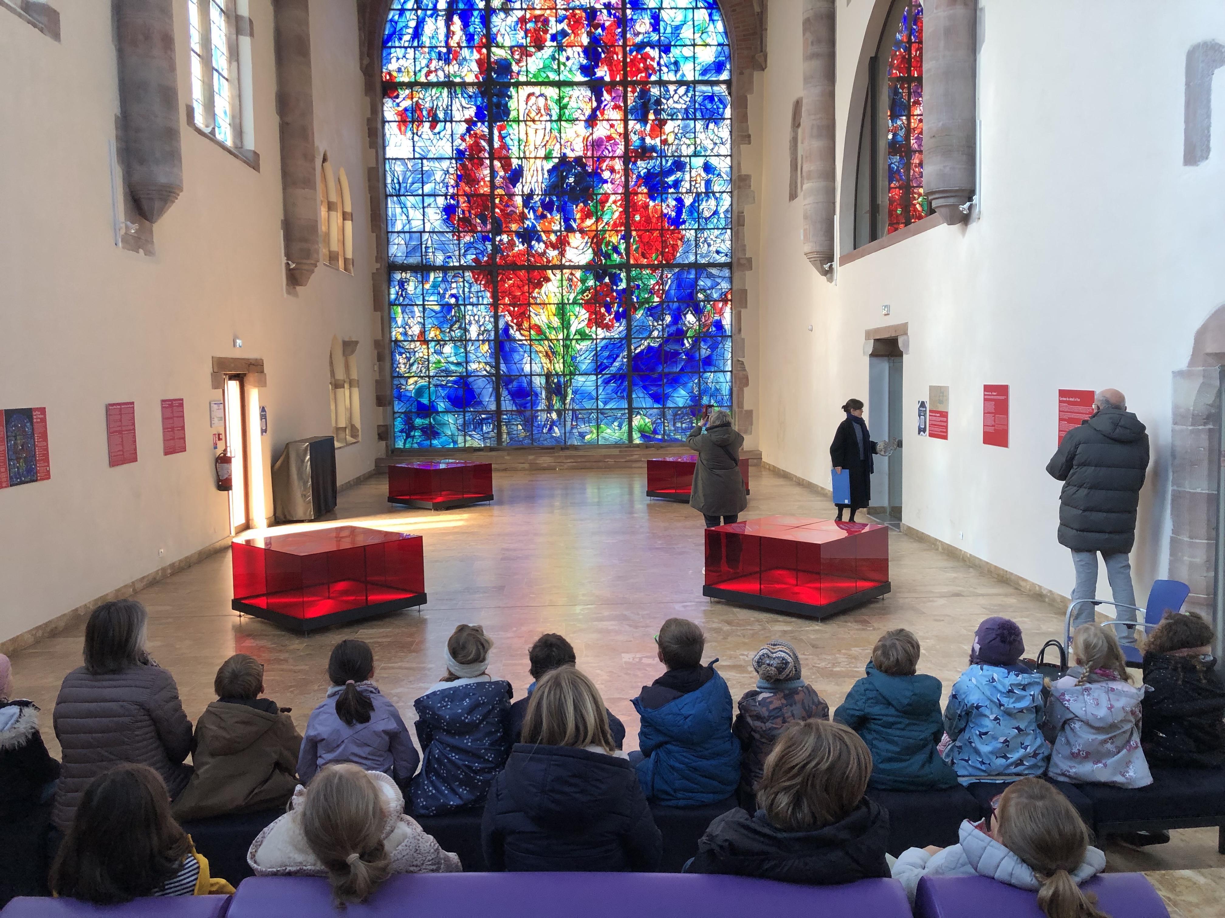 Dans le cadre d’un parcours d’éducation artistique et culturelle, l’ensemble des élèves de l’école de Saint-Quirin, de la petite section au CM2, ont participé à un projet autour du vitrail de Chagall, en lien avec le musée.