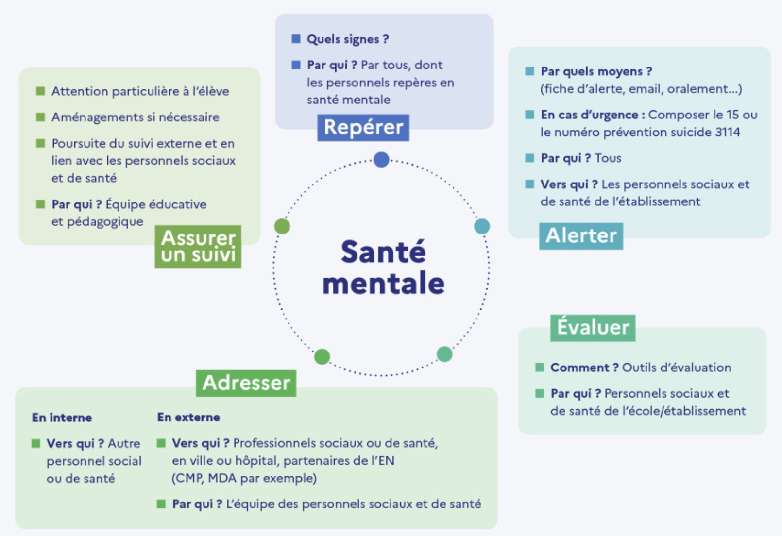 Vous trouverez dans cet article le document pour la mise en oeuvre du Protocole Santé Mentale ainsi que la présentation de Mylène Matz, infirmière scolaire et formatrice.