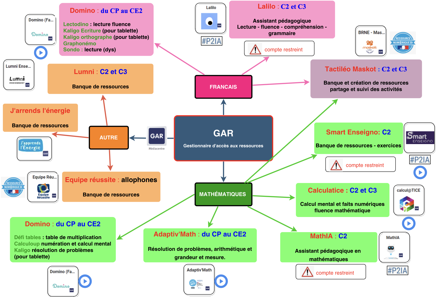 Vous trouverez dans cet article un descriptif du GAR, ainsi que des documents d'accompagnement : – un document réalisé par l'équipe nationale GAR présentant le service et la procédure d'affectation des ressources via la console (Newsletter) – une carte mentale présentant les ressources disponibles à ce jour dans le GAR.