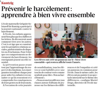 Journée de lutte contre le harcèlement scolaire - action de l’école maternelle de Kuntzig