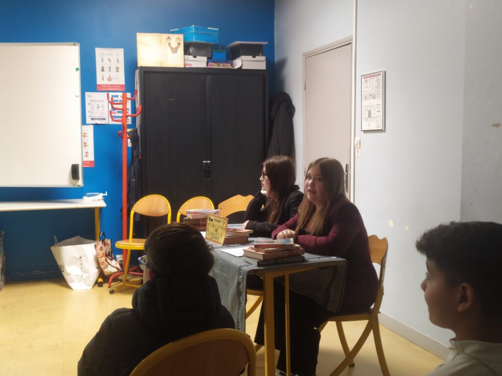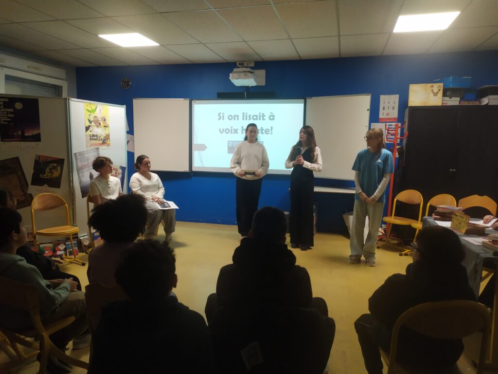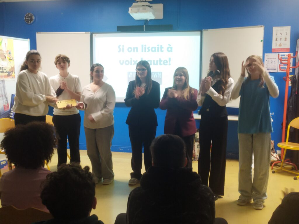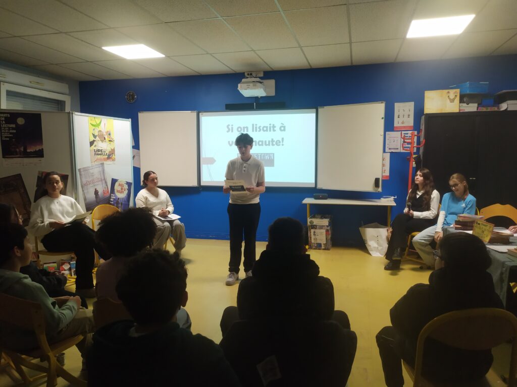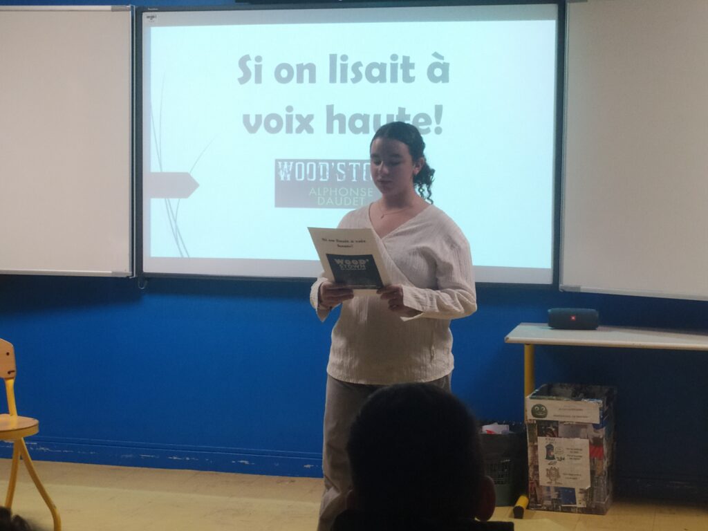 Atelier animé par Mme Lecomte, professeur de français et ses élèves de 5e. Si on lisait à voix haute est un jeu télévisé animé par Ava J. et le chauffeur de salle, Lisy R. Les candidats ( Aïdan D., Océanne D.T. et Mira T.) s’affrontent en lisant la nouvelle d’Alphonse Daudet “Wood’stown”. Un jury impartial composé de deux élèves ( Eloïse H. et Eloïse L.) doit les départager. Que le meilleur gagne!!!!