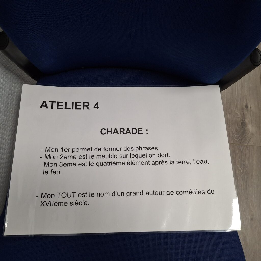 - Pour entrer dans l’atelier, les visiteurs devaient résoudre une charade. Cette dernière leur permettait de savoir quel sujet allait être abordé. Réponse : MOLIERE