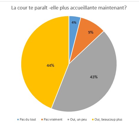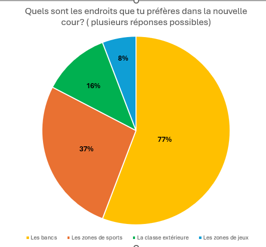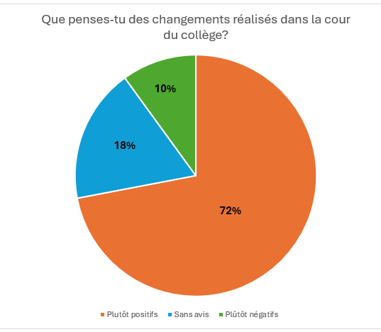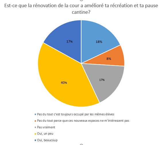 A la rentrée de septembre, les élèves ont pu découvrir leur cour totalement rénovée par le département de la Moselle. Dénommée ” cour bien être”, son but est d’améliorer le cadre de vies des élèves. Cela passe par des îlots de fraicheur, des espaces de pratique sportive, des espaces de jeux et d’une classe extérieure. Nous avons voulu savoir ce qu’en pensaient les élèves. Voici le résultat du sondage.