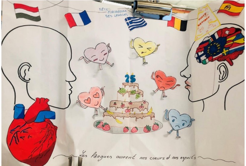 Plusieurs enseignants – Mme Marquez (anglais), Mme Bouissou (anglais), Mme Firik(espagnol) et M. Champagne (allemand), ont invité leurs élèves à participer à la création d’affiches à l’occasion du 25ème anniversaire de la Journée européenne des langues, autour de la thématique « Les langues ouvrent nos cœurs et nos esprits ! ».