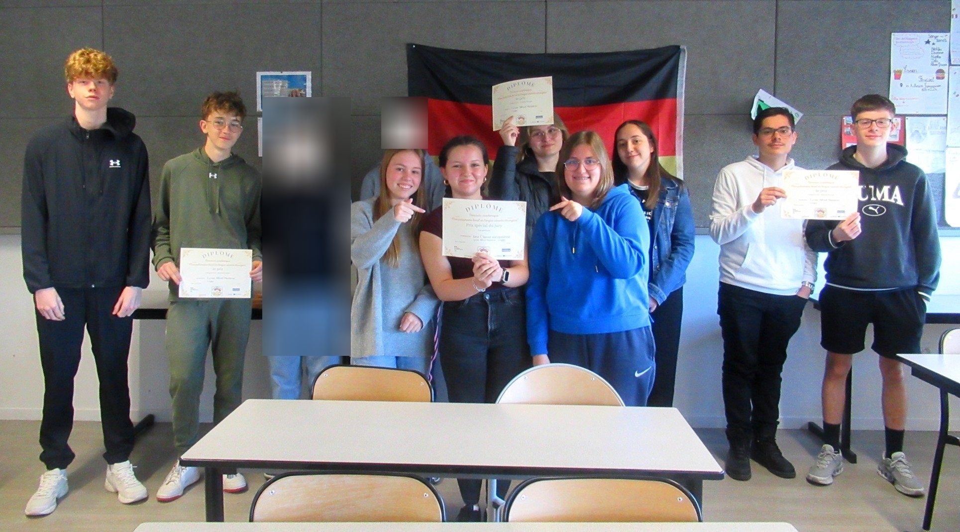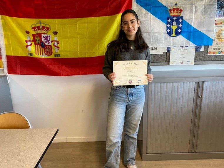 Durant la cérémonie, il y a eu un autre événement, et pas des moindre…Je vous présente Juline Hilbig, élève de première qui a remporté le premier prix du concours « Ma mobilité en 180 secondes ». La classe à Dallas, n’est-ce pas ? (Même si, en vrai, je voulais dire la classe en Galice, mais ça ne rime pas !)