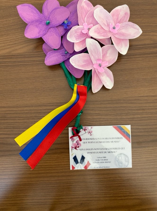 Des messages de paix ont été distribués, réalisés à la main avec l’aide de Madame Pugliese Jimenez Ivette, assistante vénézuélienne, que vous connaissez tous, dentiste internationale (et ce n’est pas une blague) : voici l’orchidée, symbole de résilience et d’espoir, emblème du Venezuela. Je ne peux pas vous partager la fleur que j’ai réalisée (elle est bien trop jolie pour l’article, (c’est complétement faux ) en réalité j’ai découpé le mot en plein milieu et arraché les pétales…), mais le cœur y est !