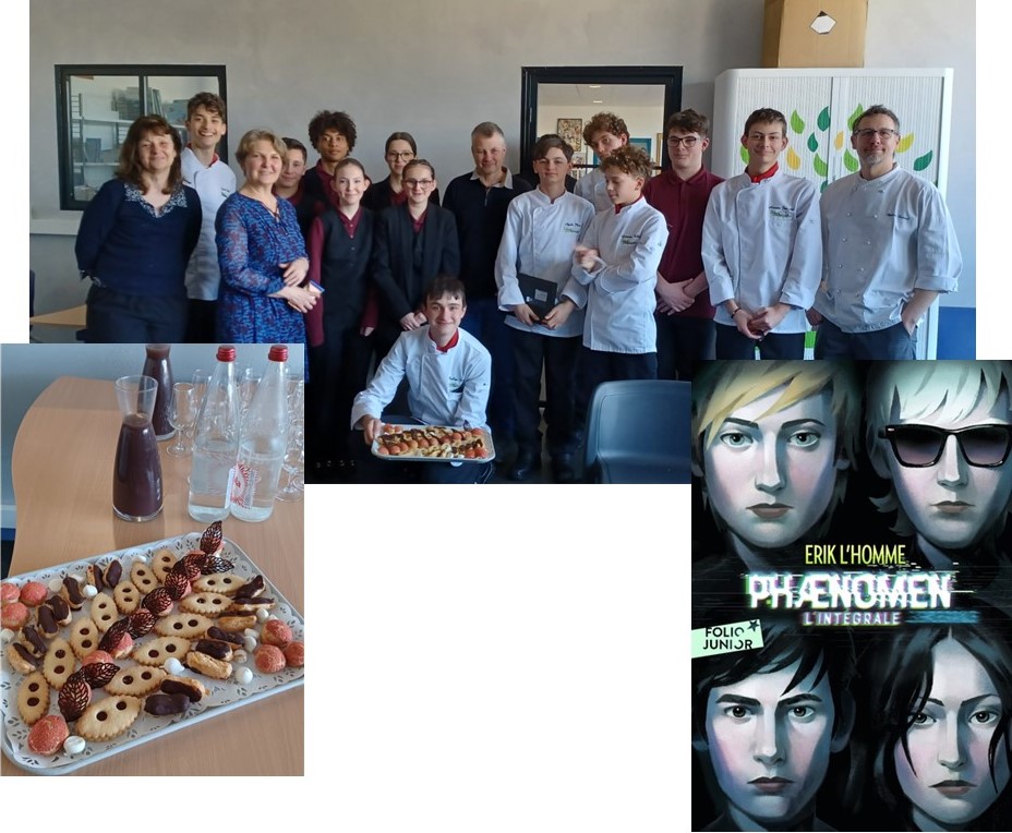 Le travail en français et en anglais, avec Mme Anghileri, Mme Blandin et Mme Blouet, sur les personnages singuliers et différents de son roman Phaenomen a inspiré la classe qui a conçu, avec M. Bernaud, des mignardises représentant les supers-pouvoirs de chacun. Avant de les déguster, l’auteur s’est amusé à retrouver les indices choisis par les élèves.